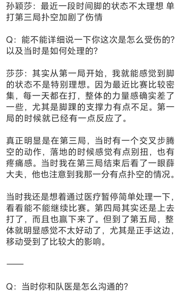 赛后孙颖莎回应伤病,表示在比赛刚开始的时候她就感觉脚的状态不是很理想,原本想着自己坚持坚持,但最终发现还是不行。
